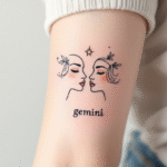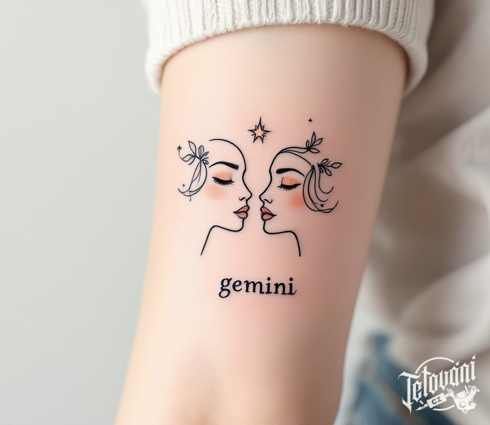 Tetování portréty, nápis, blíženci znamení zvěrokruhu na ruce