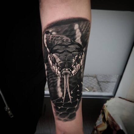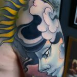 Tetování portréty, ornamenty, lebka, zvířata, pták a hadi na zádech a rukávech
