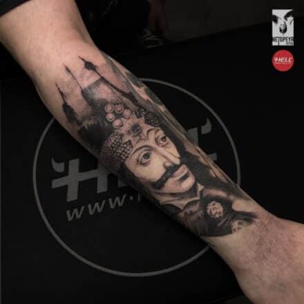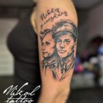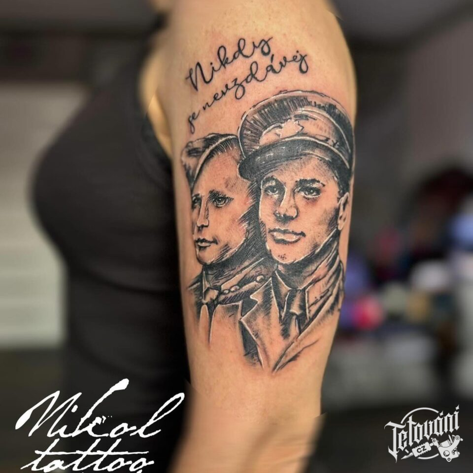 Tetování portréty osobnosti Jozef Gabčík a Jan Kubiš na paži