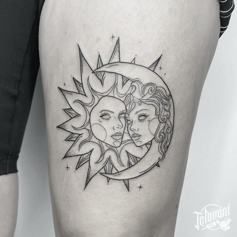 Tetování portréty, Slunce a Měsíc na stehně