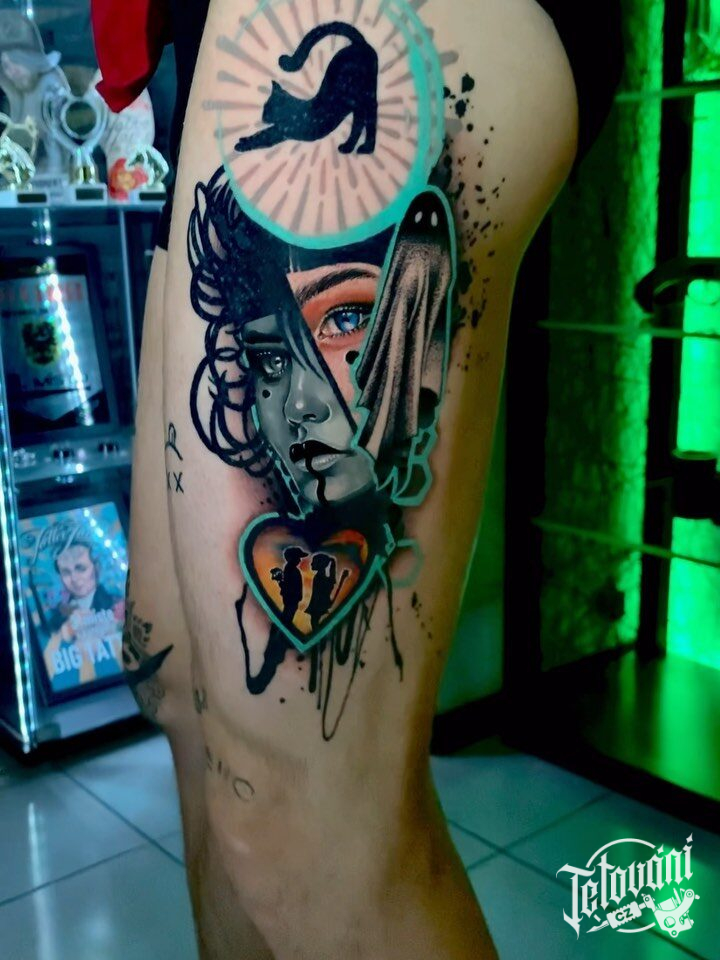 Tetování portréty, symboly lásky na stehno
