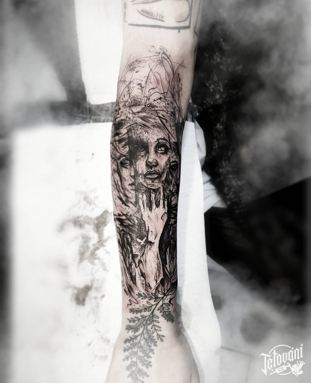 Tetování portréty tváře, ruka, symbol smutku, života na předloktí