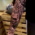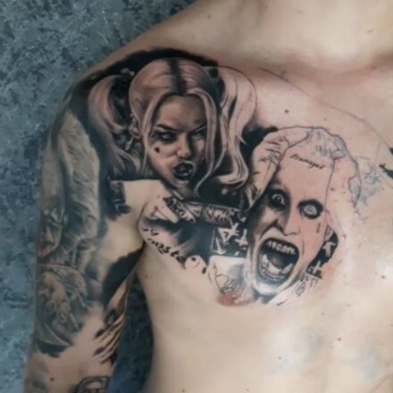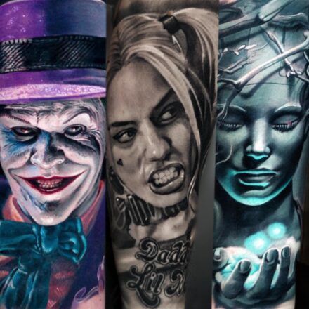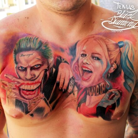 Tetování portréty z filmů a pohádek Joker a Harley Quinn, nápisy na předloktí