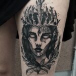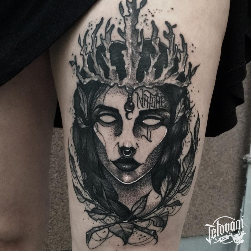 Tetování portréty, žena, koruna, květiny, nápis na stehno