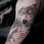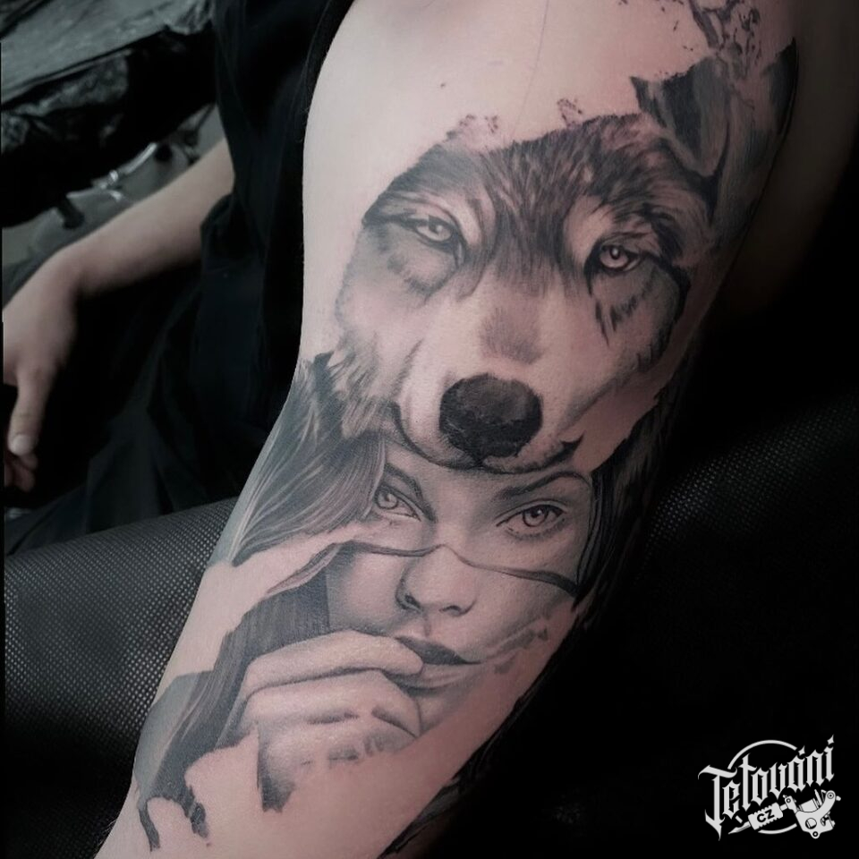 Tetování portréty ženy s vlkem, zvíře na rameno