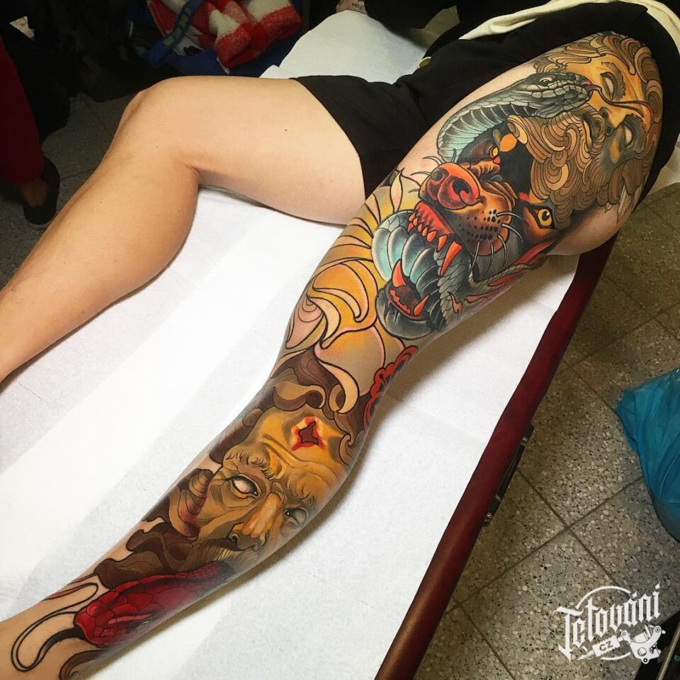 Tetování portréty, zvířata, hadi a šelma na noze