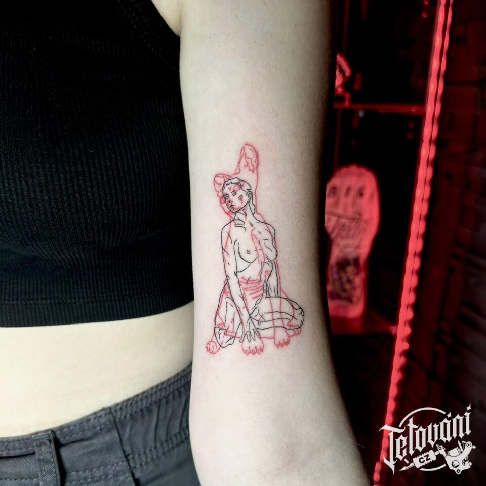 Tetování postava ženy a kočky na paži