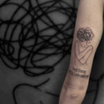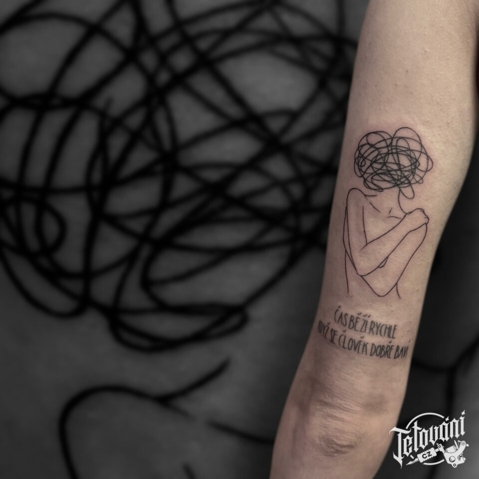 Tetování postava ženy a nápisy na ruce