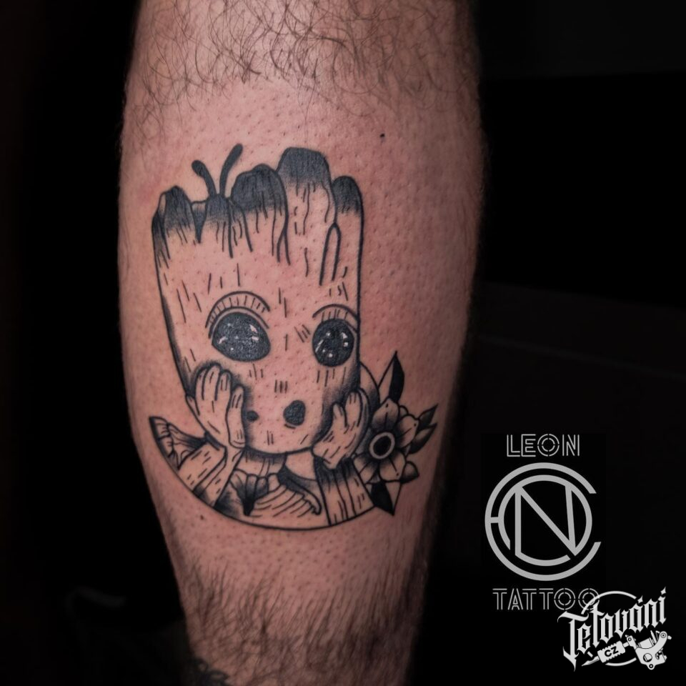 Tetování postavička Groot z filmů a pohádek na lýtko