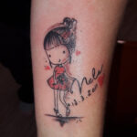 Tetování postavička holčičky s nápisem, jméno a datum narození na předloktí