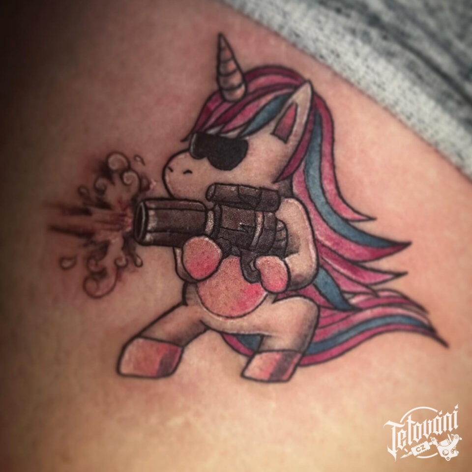 Tetování postavička jednorožce na stehno