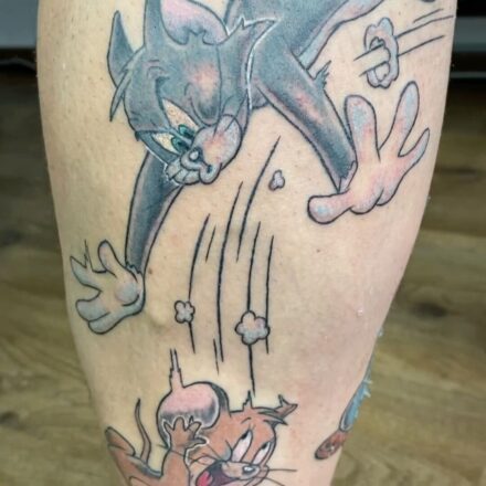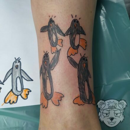 Tetování postavička kačera a nápis na holeň