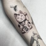 Tetování postavička, kočka, symbol štěstí na předloktí