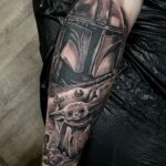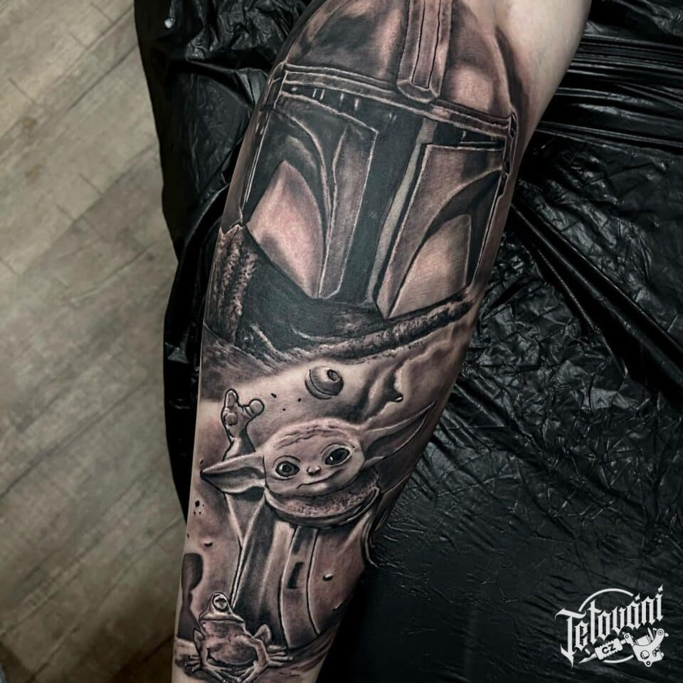 Tetování postavička Yody a Din Djarin z filmů a pohádek Star Wars na předloktí