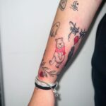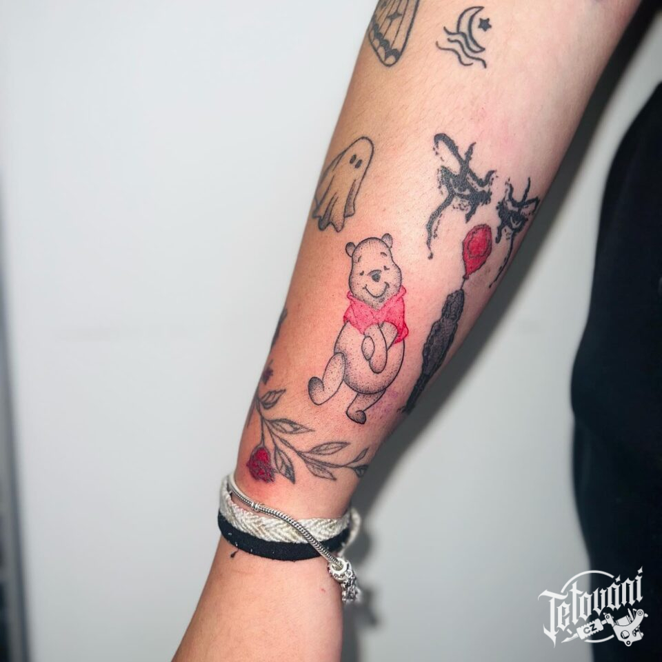 Tetování postavička z filmů a pohádek a květiny na předloktí