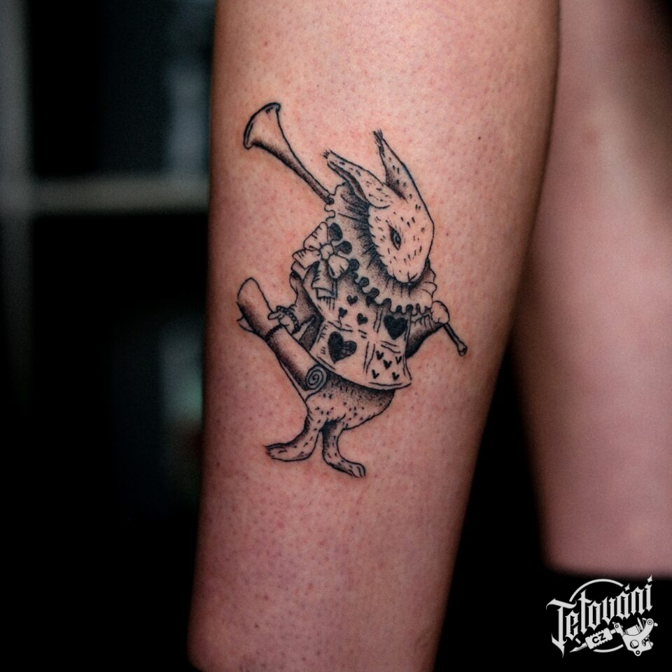 Tetování postavička z filmů a pohádek Alenka v Říši Divů na lýtko