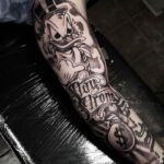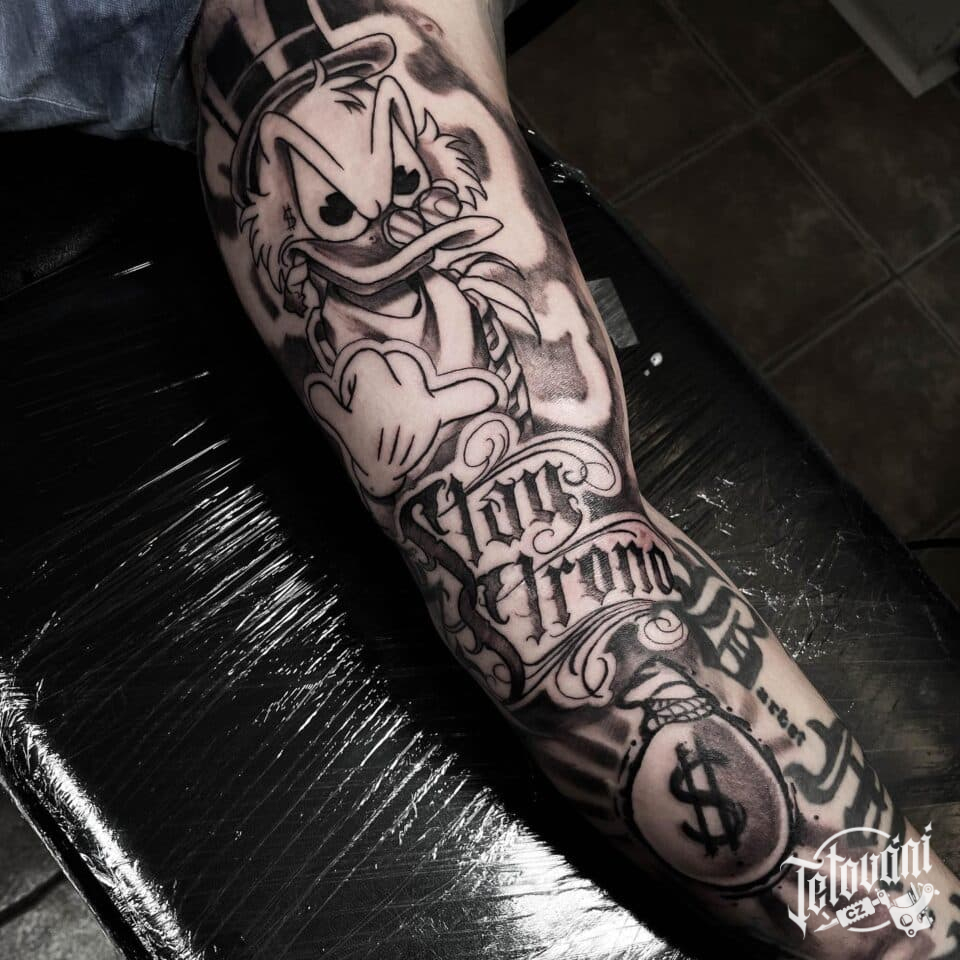 Tetování postavička z filmů a pohádek Disney, Kačer Donald, nápisy, rukáv