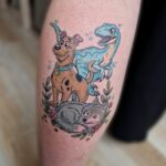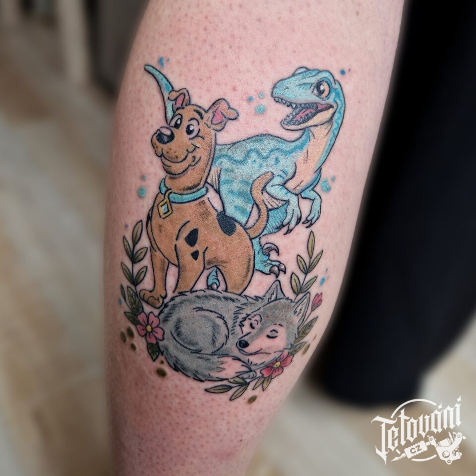 Tetování postavička z pohádky a zvířata, vlk s dinosaurem na lýtko