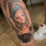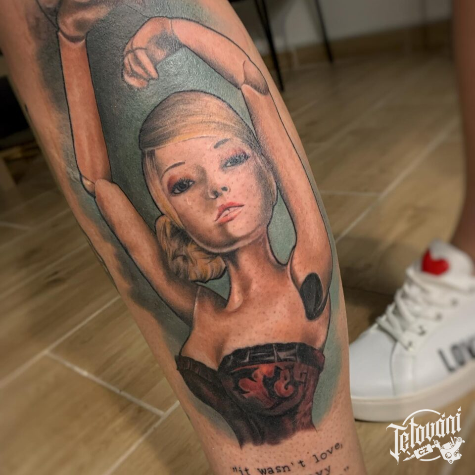Tetování postavička ženy, divadelní masky, loutka na lýtko