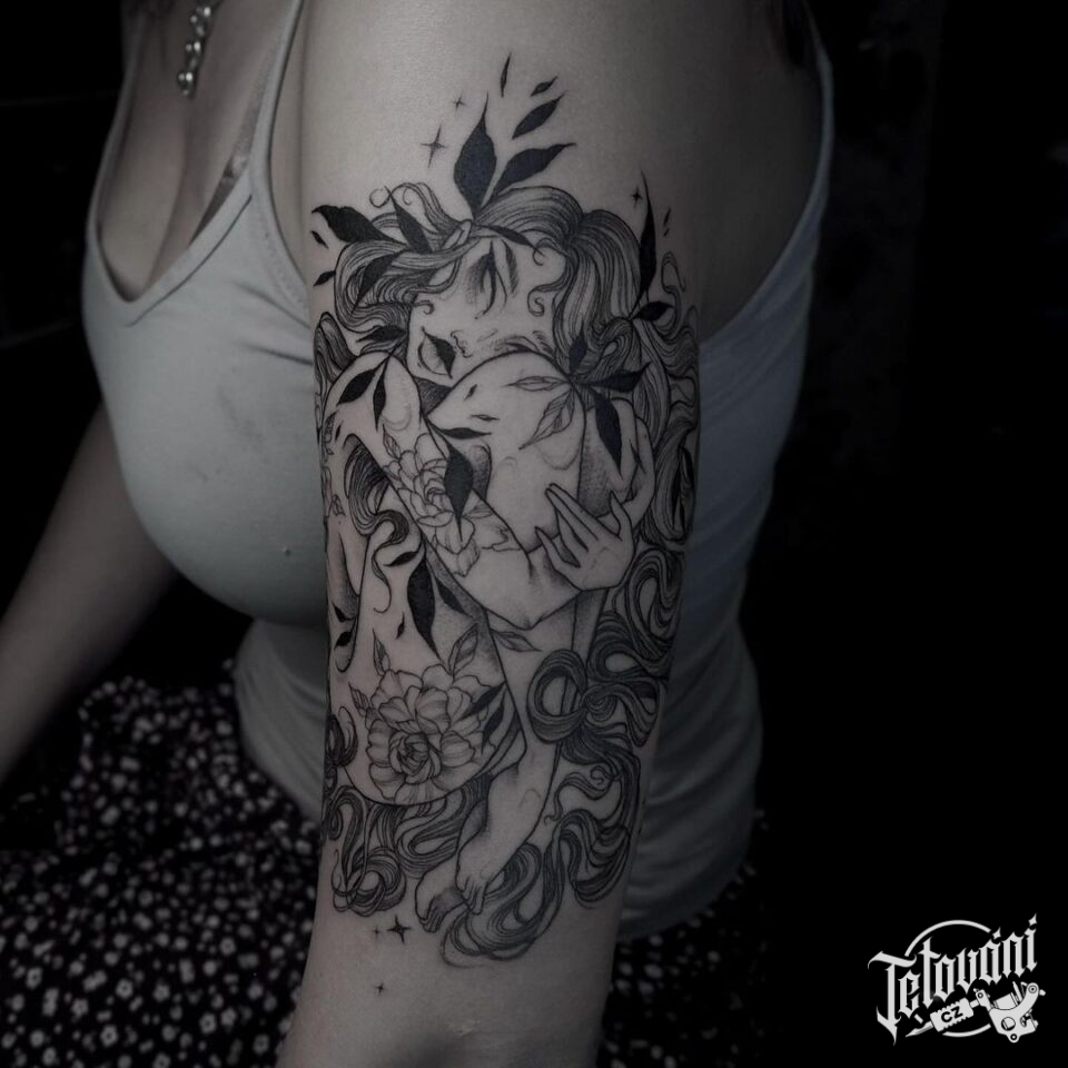 Tetování postavička ženy, květiny na paži