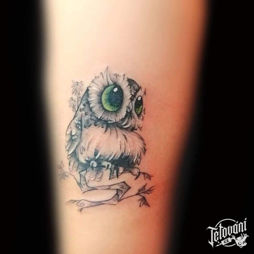 Tetování postavička, zvíře, sovička na předloktí
