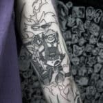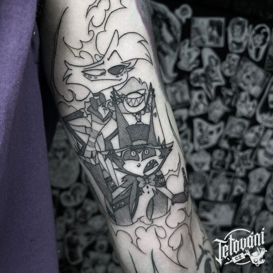 Tetování postavičky anime z filmů a pohádek Angel dust, Husk a Niffty na předloktí