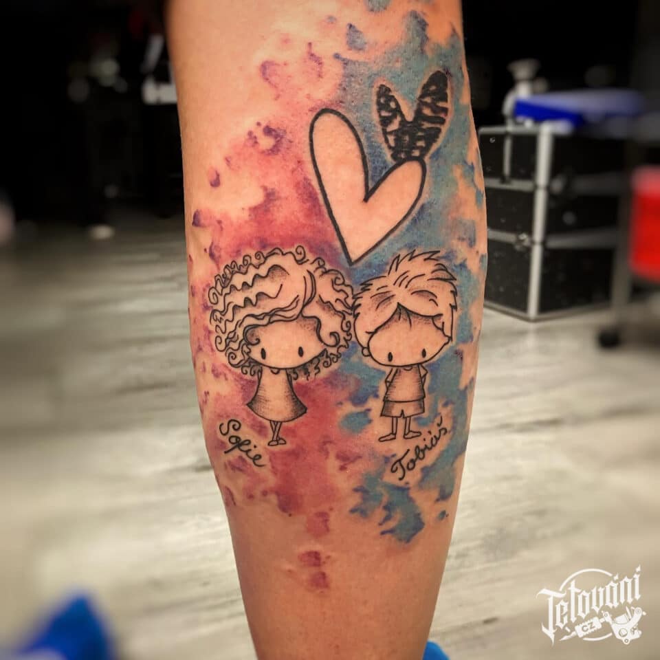 Tetování postavičky dětí se jmény na lýtku
