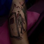 Tetování postavičky, nápisy na ruce