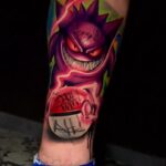 Tetování postavičky z filmů a pohádek Pokémon, nápis na lýtko