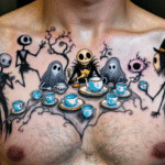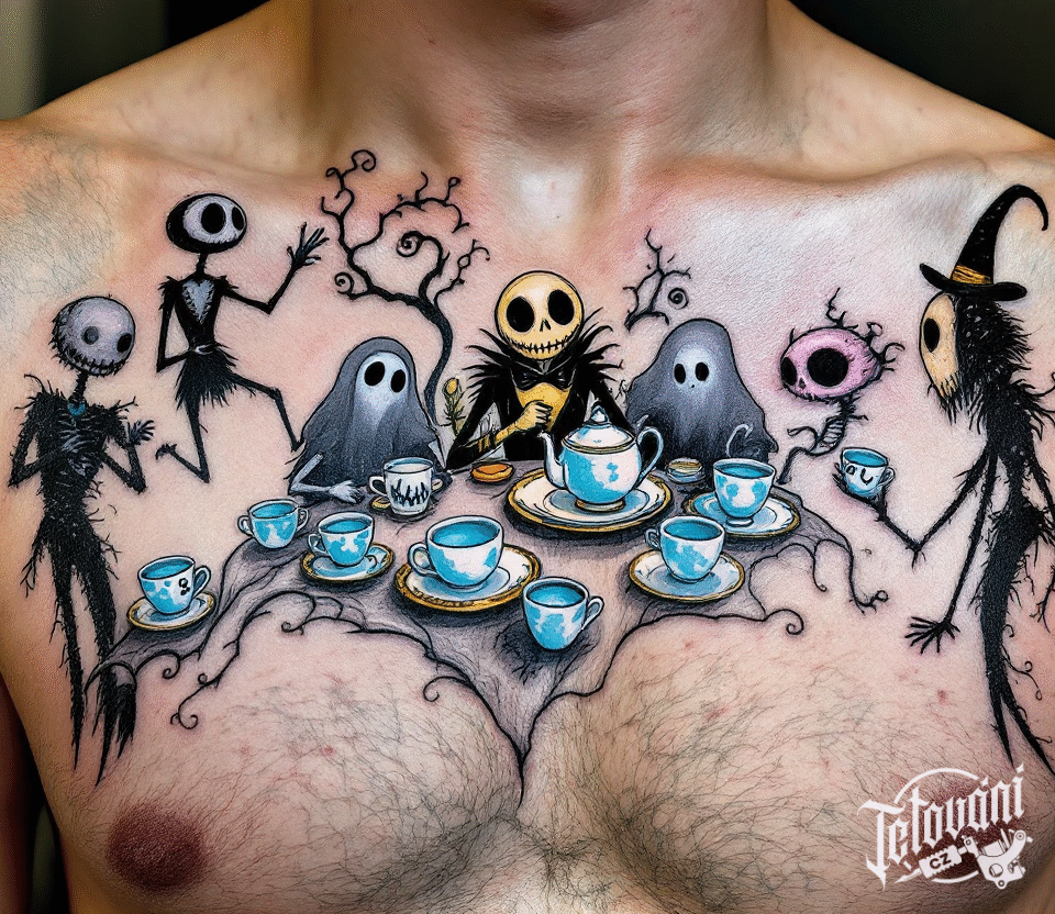 Tetování postavičky z filmů a pohádek Tima Burtona na hrudi