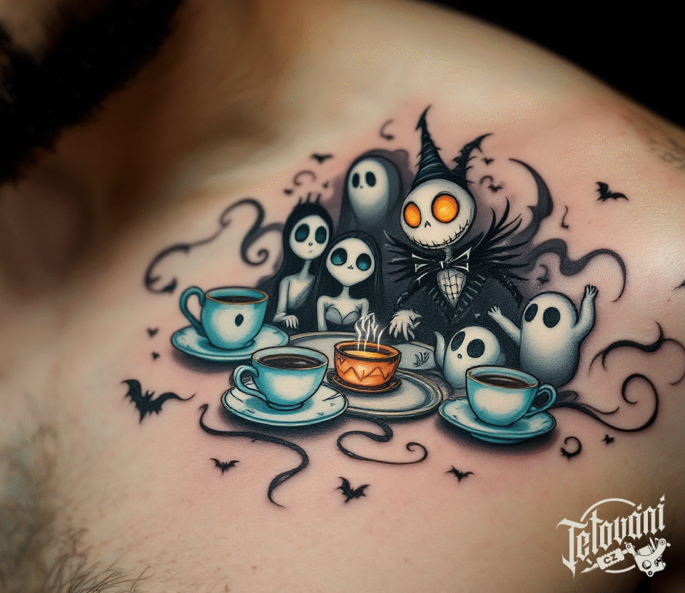 Tetování postavičky z filmů a pohádek Tima Burtona na klíční kosti