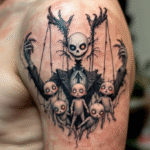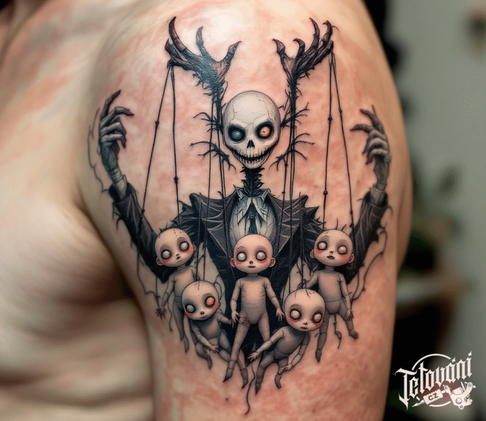 Tetování postavičky z filmů a pohádek Tima Burtona na rameni