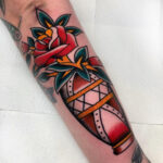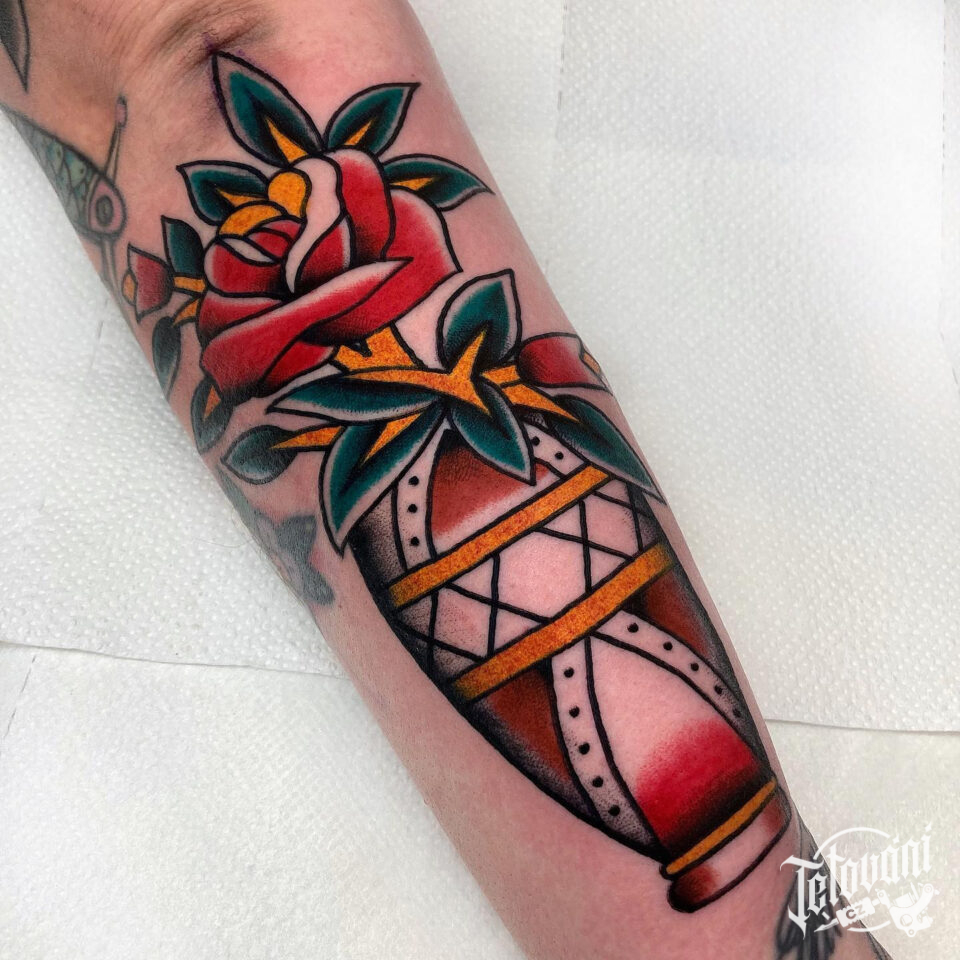 Tetování předmět a květina, růže ve váze na předloktí