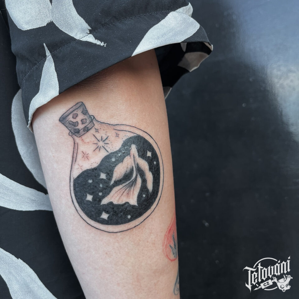 Tetování předmět a zvíře, rybička v láhvi na předloktí