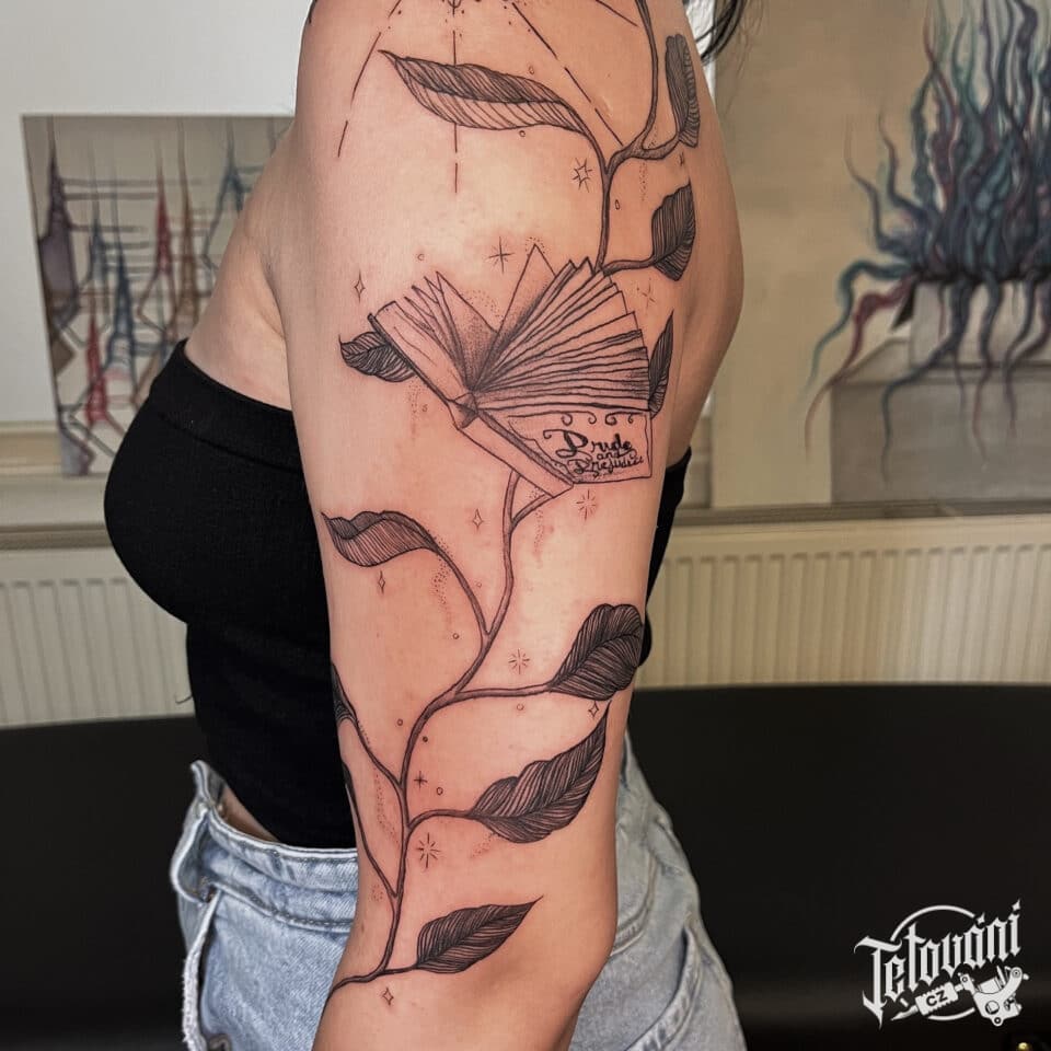 Tetování předmět, kniha s květinou na rameni