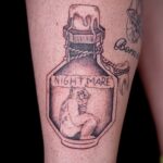 Tetování předmět, lahvička a nápis na stehno