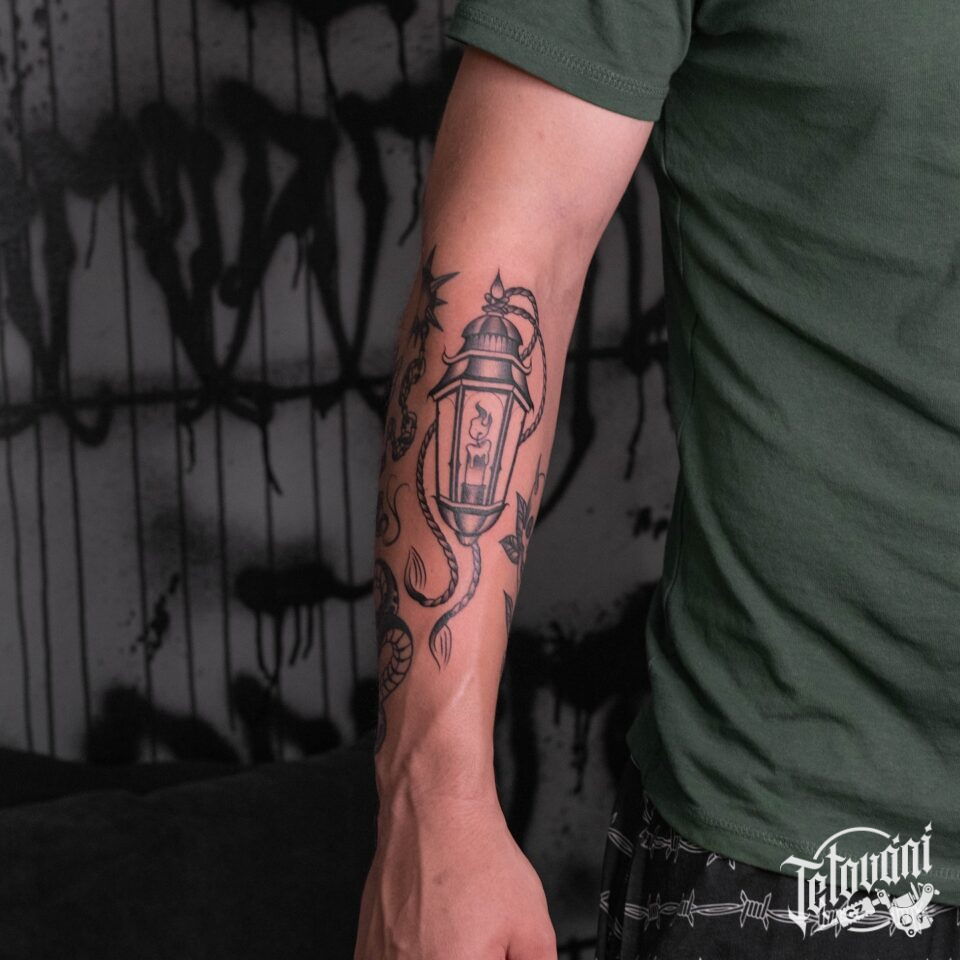 Tetování předmět lucerna, svíčka, oheň na předloktí