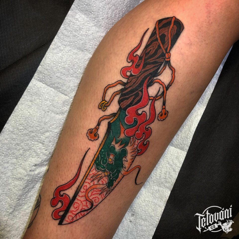 Tetování předmět, mýtická bytost, drak v noži na lýtku