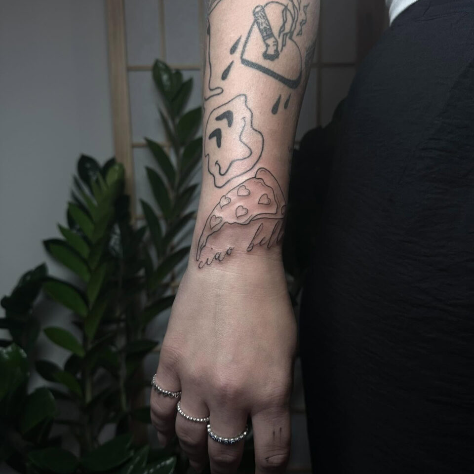 Tetování předmět pizza a nápis na zápěstí