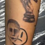 Tetování předmět, portrét a symbol smutný smajlík na předloktí