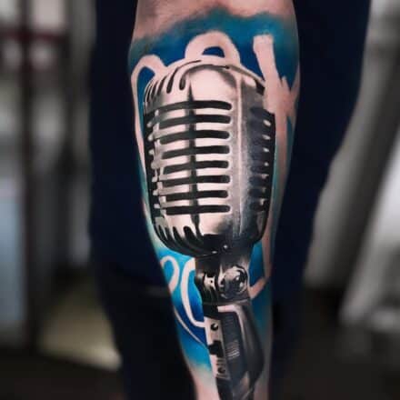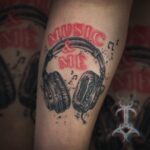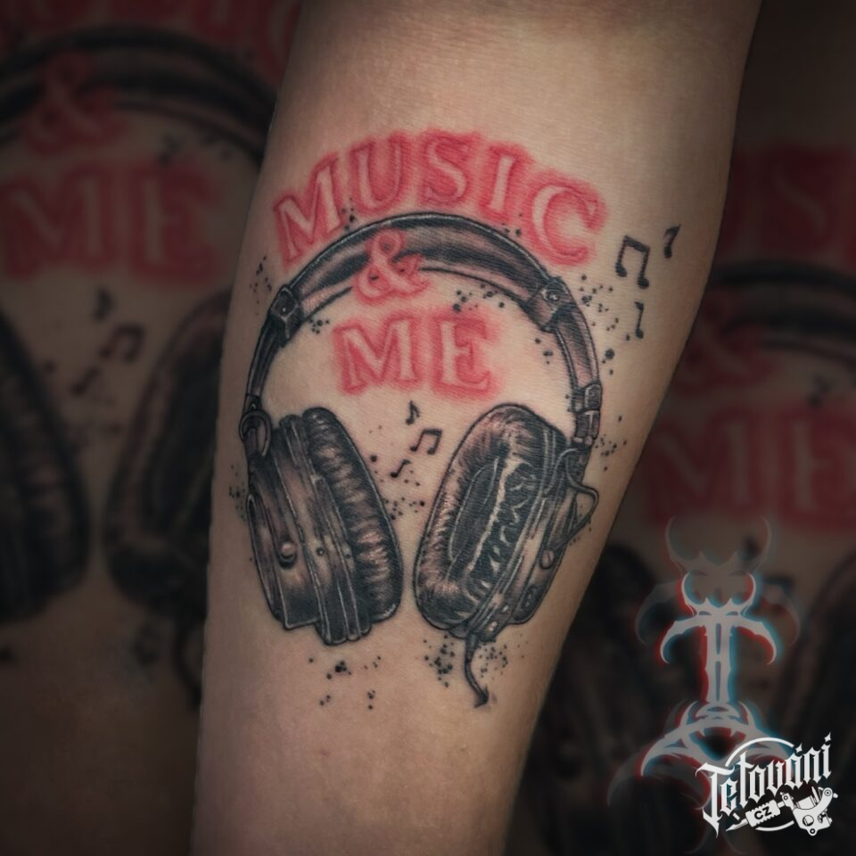 Tetování předmět, sluchátka, hudba, nápis na předloktí