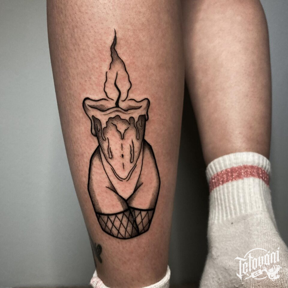 Tetování předmět svícen, oheň na lýtko