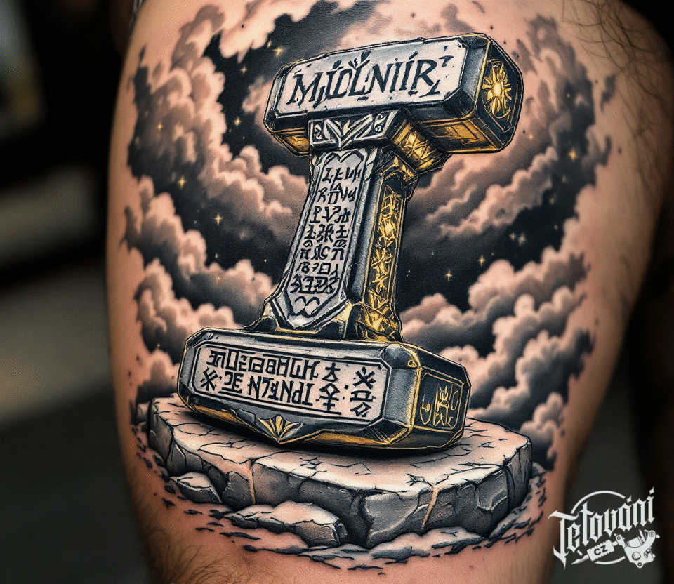 Tetování předmět, Thorovo kladivo z filmů a pohádek a znaky a symboly na bok stehna