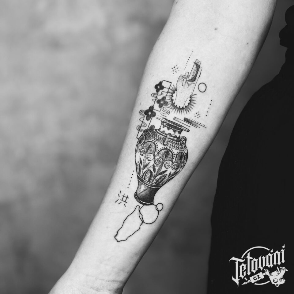 Tetování předmět, váza, tečky a tvary na předloktí