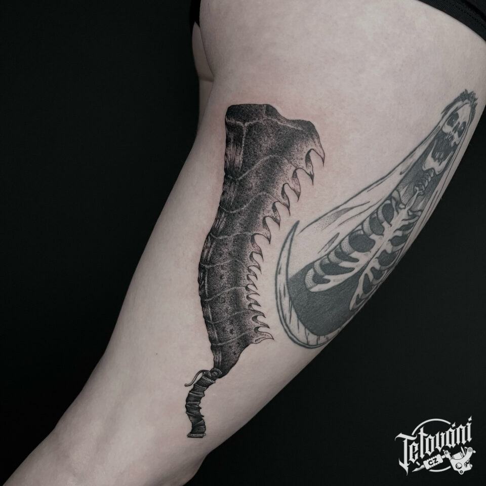 Tetování předmět z Bloodborne na boku stehna