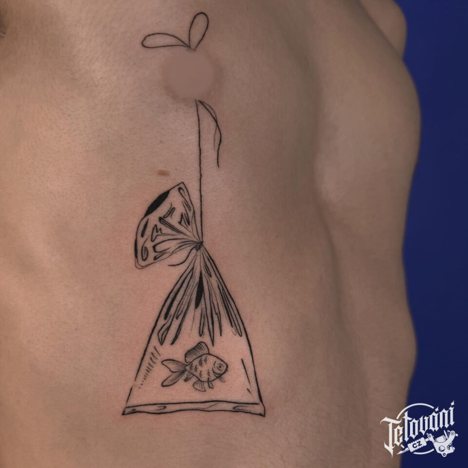 Tetování předměty a zvíře, rybička v sáčku na žebrech