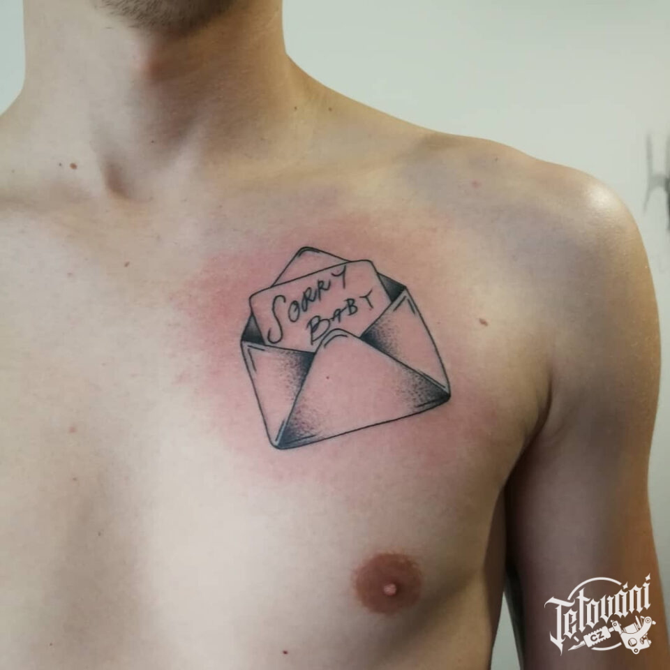 Tetování předměty, dopis a nápisy na hrudi