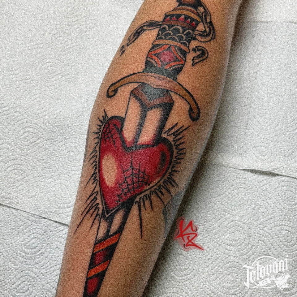 Tetování předměty, dýka, zlomené srdce na lýtku