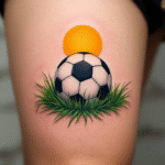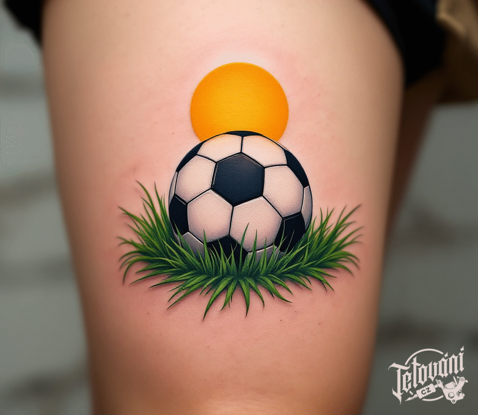 Tetování předměty, fotbalový míč a Slunce na stehně