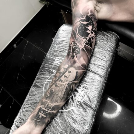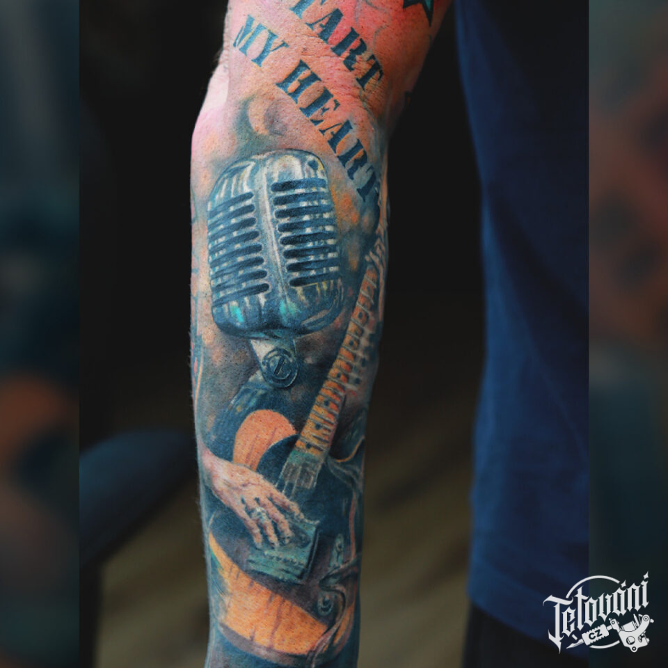 Tetování předměty, hudba, kytara a mikrofon, nápisy,rukáv